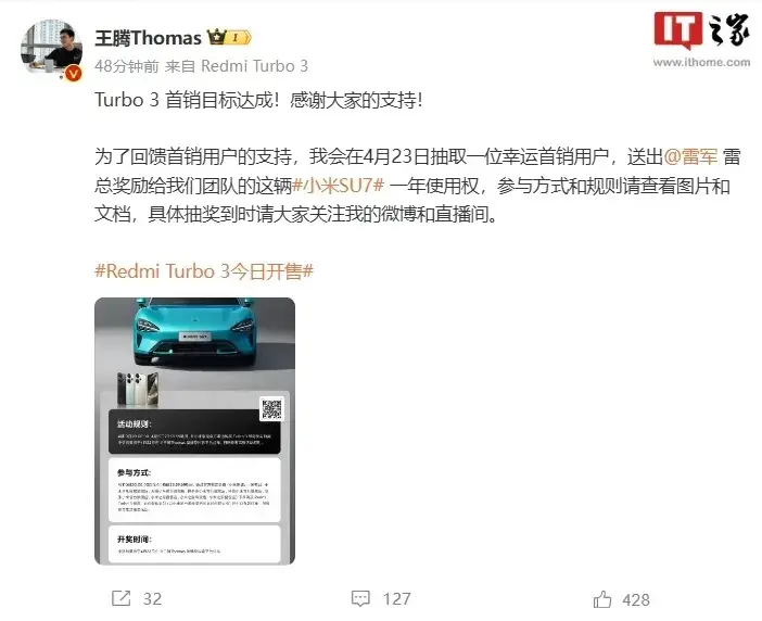 redmi turbo 3刷新了所有先前的纪录,销量破百万!王腾大手笔回馈用户,抽取小米su7一年使用权!赶紧来了解更多!